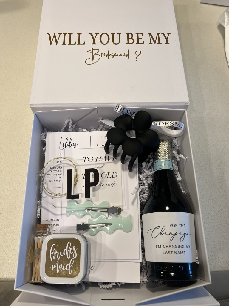 I had been looking forward to this my whole life! Girls always say "you'll be my bridesmaid one day!", but it was finally time to make it real! I have 2 sisters and a sister-in-law, a life-long childhood friend, a high school friend from my time in Georgia, a high school friend from my time in California, and 6 college friends, so 11 bridesmaids in total! I had my 9-year-old niece as my flower girl! I made bridesmaids boxes to ask them. It had a bottle of champagne, luggage tag since it was a destination wedding, claw clips, clips to hold your hair back for makeup, candles & matches, and a detail card!