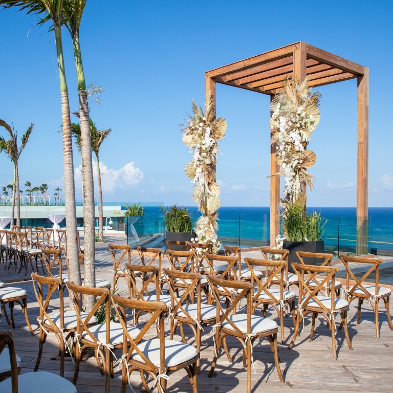 Secrets Moxche stands out with its striking architecture and majestic settings. This resort offers a variety of breathtaking venues, ensuring your wedding environment is as extraordinary as the ceremony itself. The crown jewel of this resort is the stunning rooftop sky gazebo. Expansive ocean views, modern boho vibes and utter privacy blend to make this a very dramatic, memorable wedding venue.
