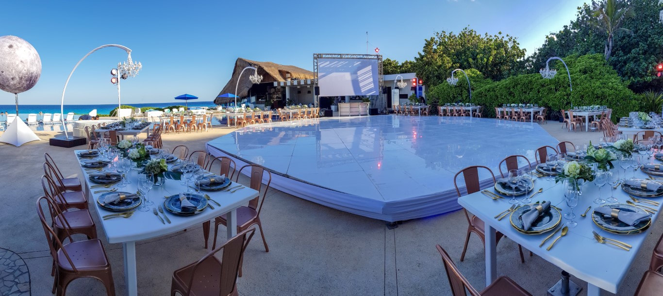 For those seeking a unique space, the Pool Club faces the sea and is caressed by the Caribbean breeze, featuring a pool bar open during the day and a private area at night. The Azur Pool, although not available for ceremonies, can be used for cocktail receptions, and the pool can be covered with glass flooring for additional seating. The Presidential Suite Terrace offers an exclusive and luxurious option for your celebration. You can even rent out one of two restaurants for an additional fee, including one that boasts a small cenote.